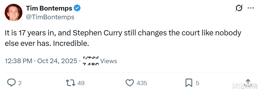正如名记Tim Bontemps赛后所说,库里的球场影响力依旧无人能及,17年如一日,他真的太不可思议了。