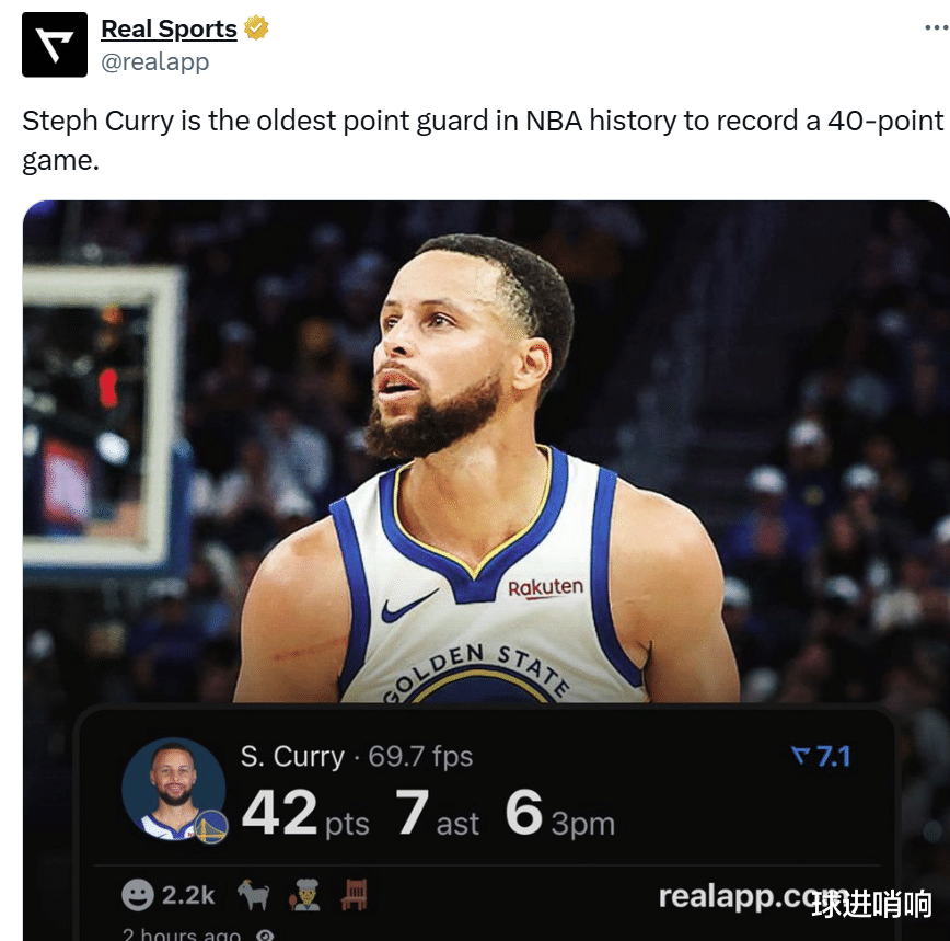 同时37岁236天的库里成为NBA历史上单场砍下40+最老的控卫球员。