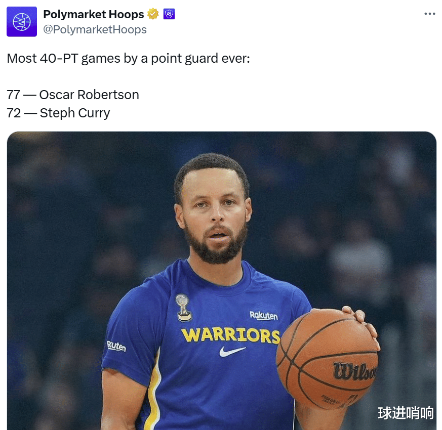 如果进一步将范围缩小到控卫,库里72次40+得分表现位列历史第二,仅次于奥斯卡-罗伯特森(77次)。