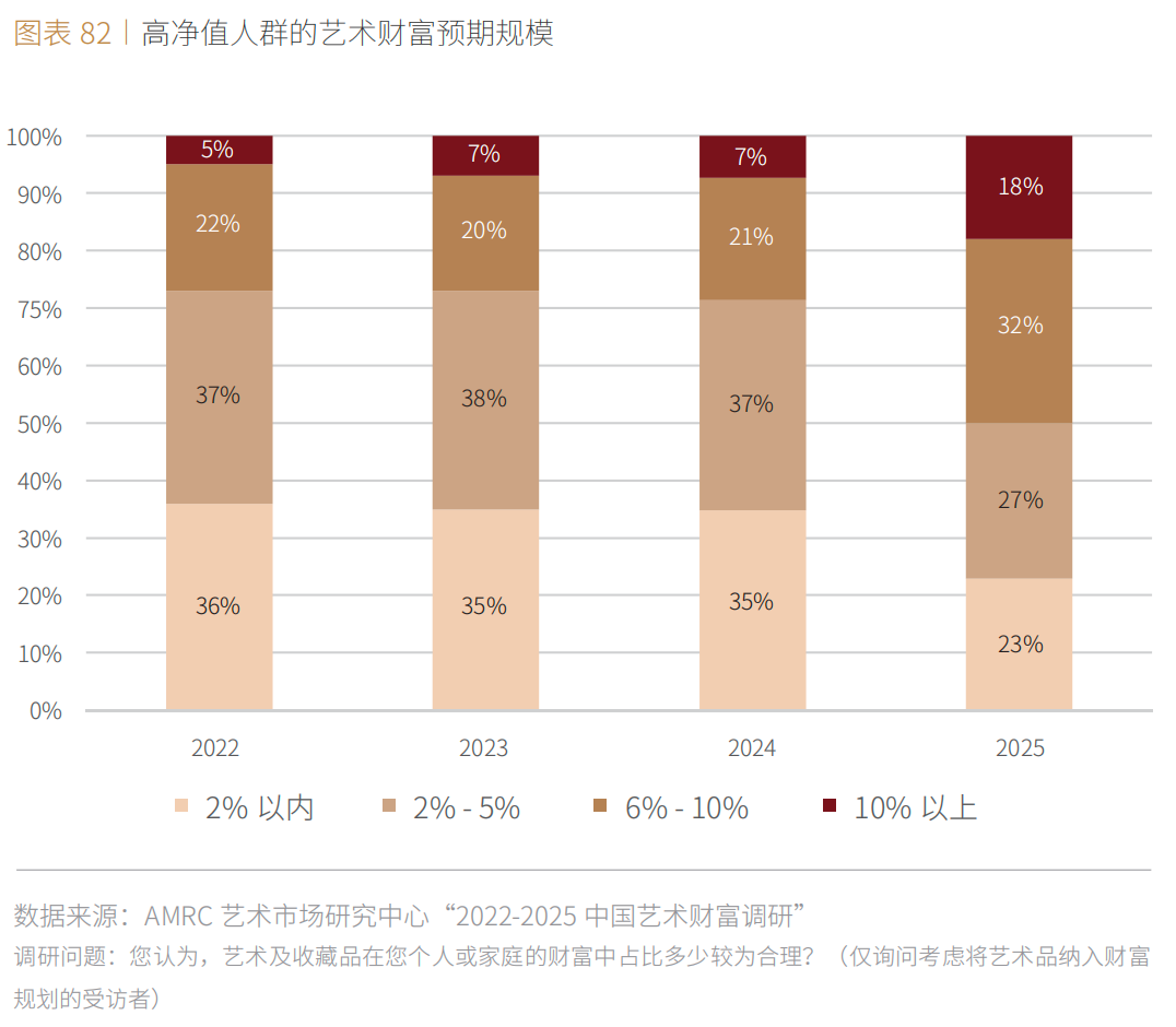 ■ 配置比例方面,在考虑将艺术品纳入财富规划的高净值人群中,77%认为艺术收藏品应在个人及家庭财富中占比2%以上。