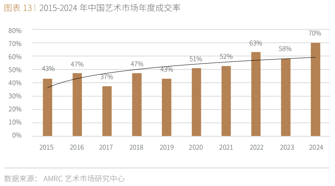 ■ 2024年中国艺术市场拍卖成交率攀升至70%,同比上升12个百分点,创下历史新高,反映出中国艺术市场供需两端对艺术品价值的共识逐步强化。