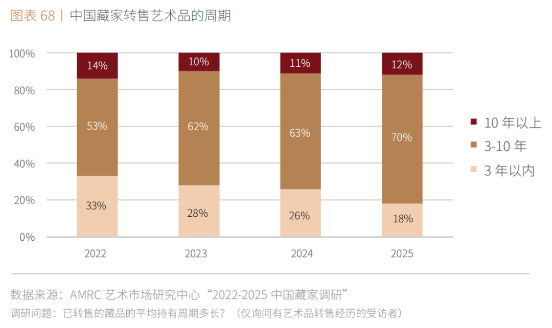 ■ 在有转售经历的中国藏家中,82%的受访者持有艺术品的平均周期在3年以上,其中,12%平均持有周期超过10年,同比分别增长8个百分点和1个百分点。