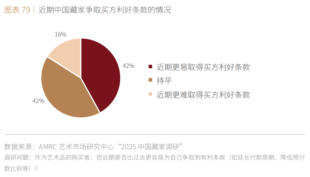 ■ 42%的中国藏家表示,近期比过去更容易在艺术品交易中取得对买方利好的条款,42%认为状况持平,仅16%表示当前更难取得买方利好条款。
