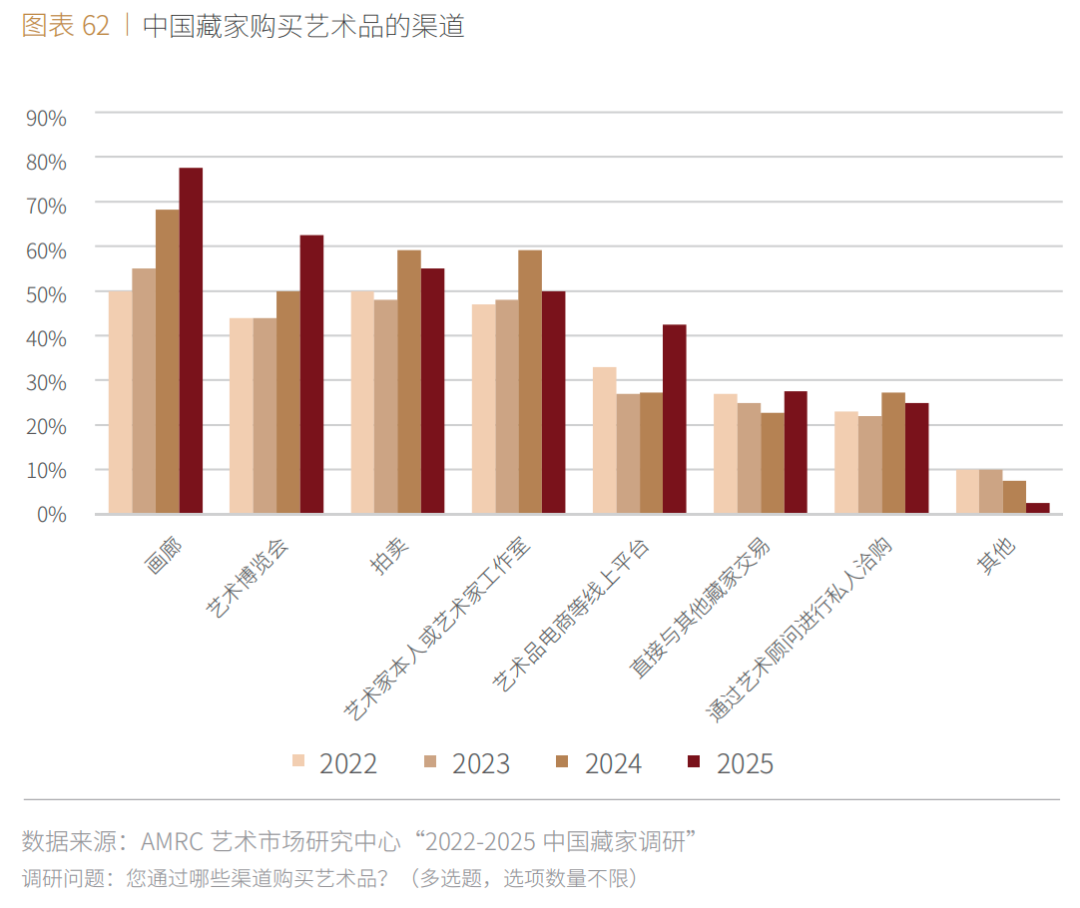 ■ 2025年,艺术博览会(63%)首次超过拍卖(55%),成为第二大受中国藏家欢迎的艺术品购买渠道。通过艺术博览会购藏艺术作品的受访者比例同比增长13个百分点。