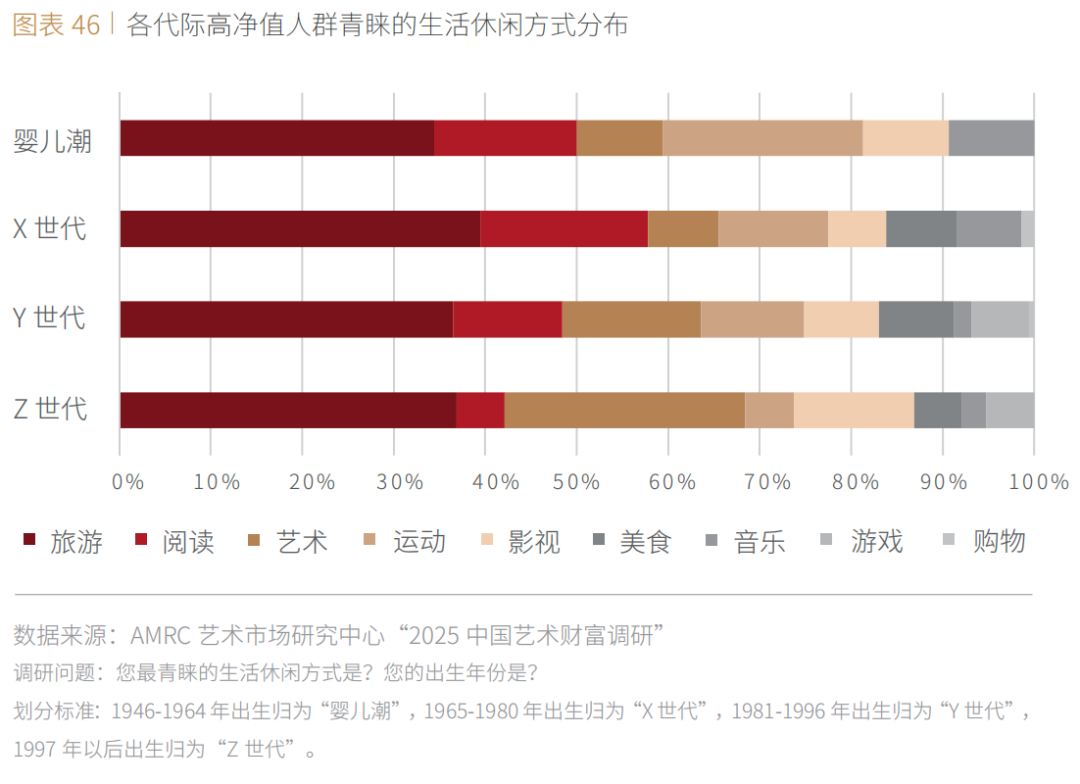■ 在中国高净值人群中,分别有26%的Z世代和15%的Y世代将艺术作为主要的生活休闲方式之一,远高于X世代(8%)和婴儿潮(9%)。